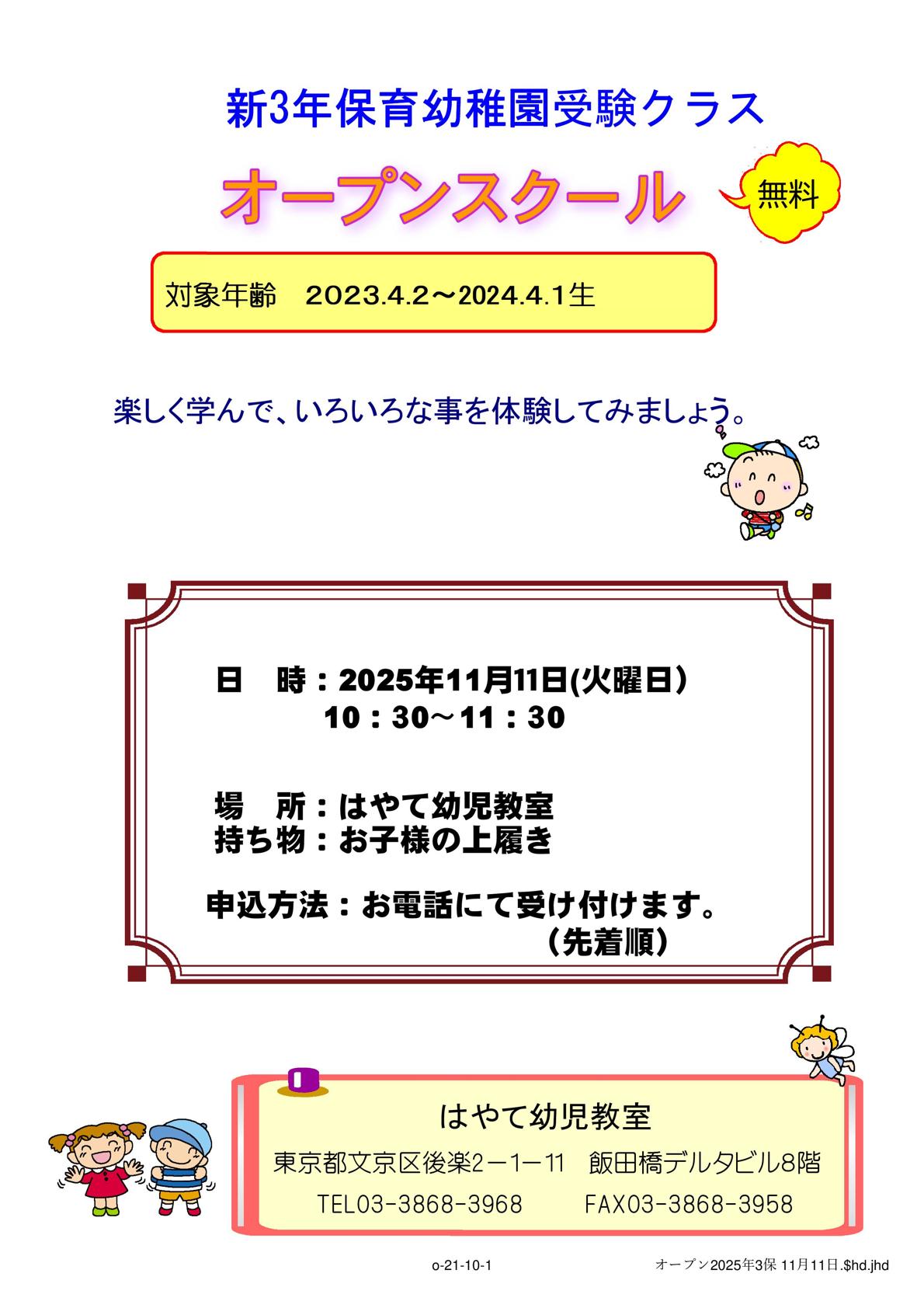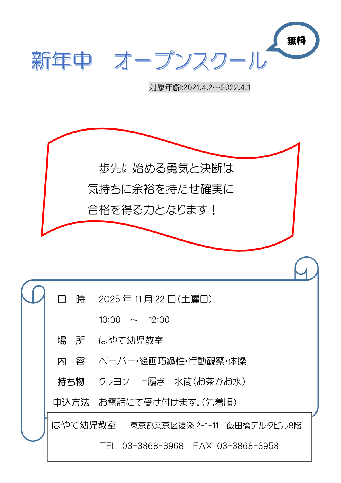 2015年1月5日(月)、東京・飯田橋に小学校受験・幼稚園受験専門塾「はやて幼児教室」が開校します。見学等承っております。03-3868-3968までお電話頂き、お気軽にご来校下さい。